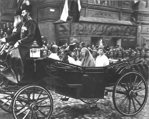 Grand Duchesses Olga (back to the camera), Tatiana and Anastasia in a carriage with their aunt, Grand Duchess Elizaveta Fyodorovna