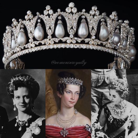 Sessan married the Crown Prince of Denmarn in 1869 and took the tiara with her to Copenhagen. Frederik and Louise became Denmark’s king and queen in 1906. In her hands, the tiara became a part of a married parure, matched up with other similar pieces of pearl and diamond jewelry to make a set. A large diamond brooch with five pearl pendants had been made to match the tiara at the time of its original creation, and Louise inherited the brooch along with the tiara.
