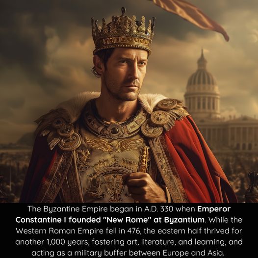 när kejsare Konstantin I grundade "Nya Rom" i Bysantium, senare känt som Konstantinopel. Medan Västromerska riket föll 476 frodas östra halvan i ytterligare 1 000 år, fostrade konst, litteratur och lärande, och fungerade som en militär buffert mellan Europa och Asien. Bysantinska riket bevarade mycket av romsk lag och kultur, vilket påverkade både medeltida och moderna Europa.