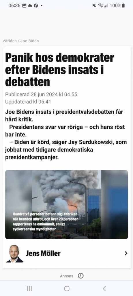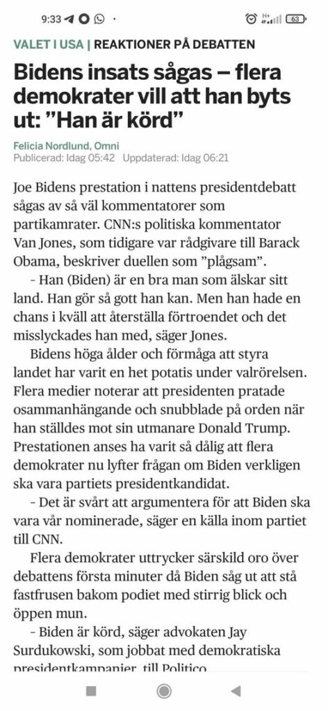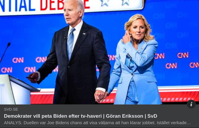 "Duellen var Joe Bidens chans att visa väljarna att han klarar jobbet. Istället verkade Biden bli för gammal i direktsändning, och direkt efteråt rapporterade CNN om panik i Demokraterna – och att Bidens kandidatur ifrågasätts.