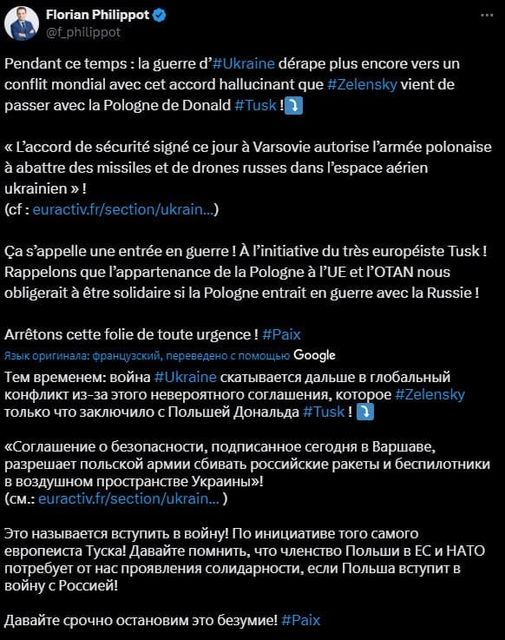 Florian Philippot på X: Under tiden: #ukrainska kriget glider vidare in i en global konflikt med detta otroliga avtal som #Zelensky just har gjort med Donald #Tusks Polen! ⤵️
