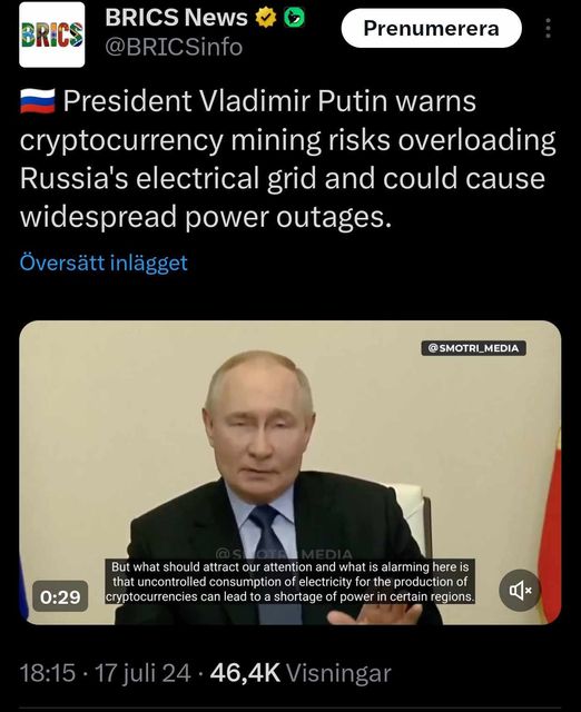 I Ryssland står brytning av kryptovalutor för 1,5 % av landets totala energiförbrukning, siffran fortsätter att växa