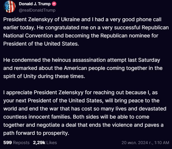 Den republikanska kandidaten till novembers presidentval skrev i ett inlägg på Truth Social att han "hade ett mycket bra telefonsamtal" med Zelensky, som gratulerade honom till en "mycket framgångsrik" republikansk nationalkonvent och fördömde förra helgens "avskyvärda mordförsök".
