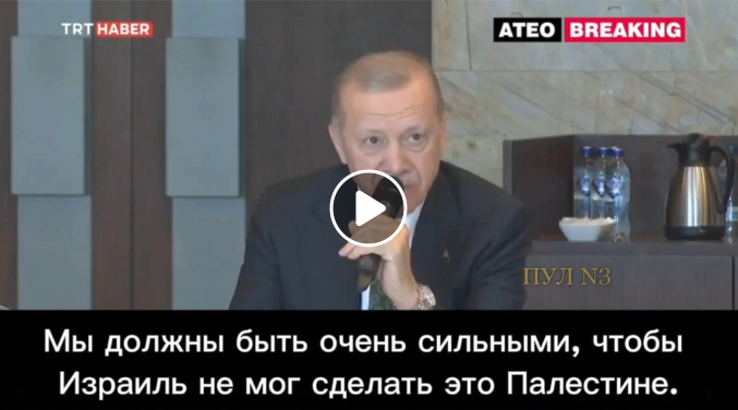 Erdogan: Vi måste vara väldigt starka så att Israel inte kan göra detta mot Palestina. Türkiye kan ta sig in i Israel på samma sätt som Karabach och Libyen. Vi kommer att göra samma sak med dem. Det finns ingen anledning att inte göra detta. Vi måste bara vara starka så vi kan ta dessa steg.