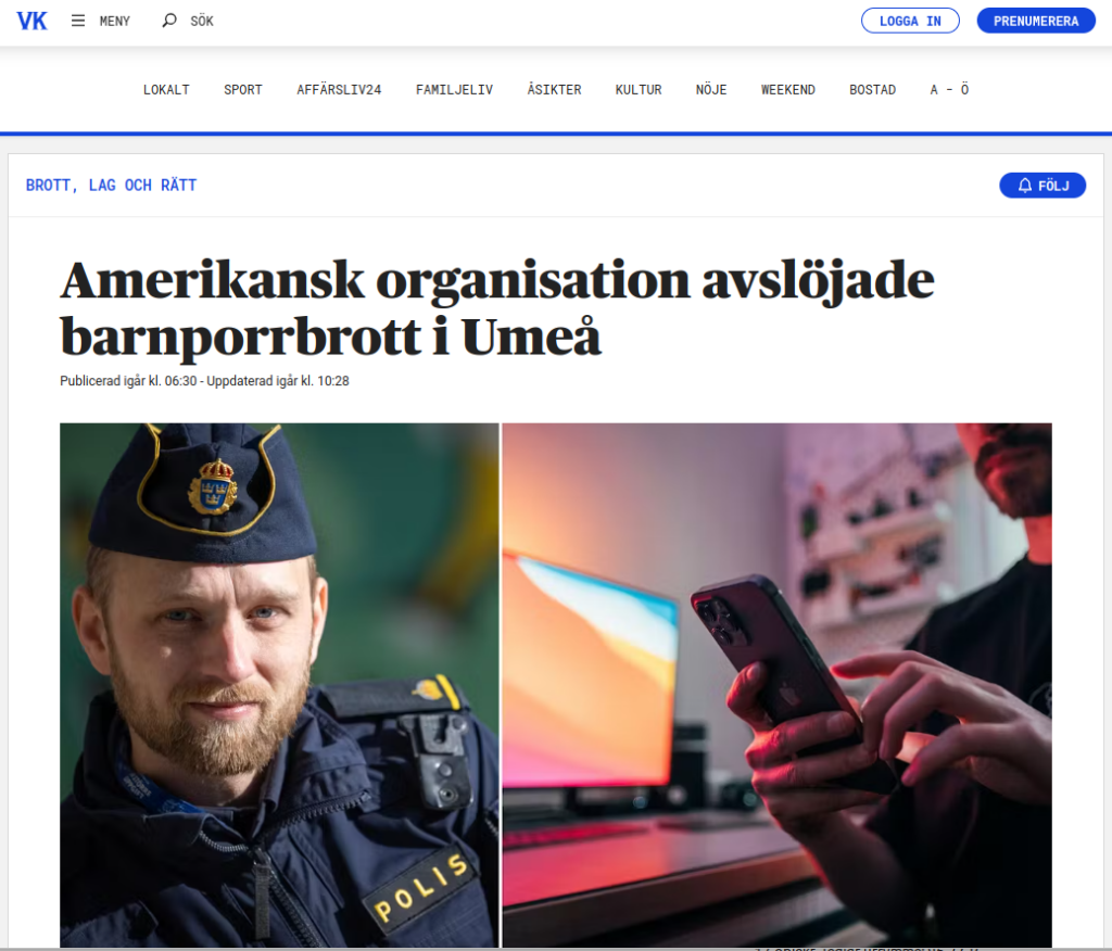 https://www.vk.se/2024-08-22/amerikansk-organisation-avslojade-barnporrbrott-i-umea-1e8e5?pak=o3LK0bHSG1Thb5MFmV___HHTzalIniEumQQLbz9UUkjlrvcqeEl0rm13EYqrjInO1i8wgPtXiZa8i2pPzhYWBnXwM96S8K7AVOPcUu