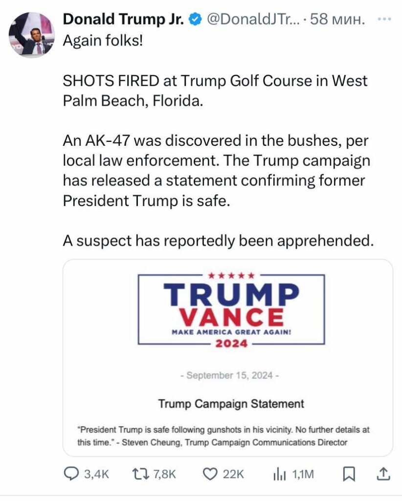 Det misstänkta mordförsöket är det andra på två månader mot Donald Trump. Den 13 juli träffades han av en kula i örat och skadades lindrigt vid ett mordförsök under ett valmöte i Butler i Pennsylvania. En åhörare dödades och två skadades."