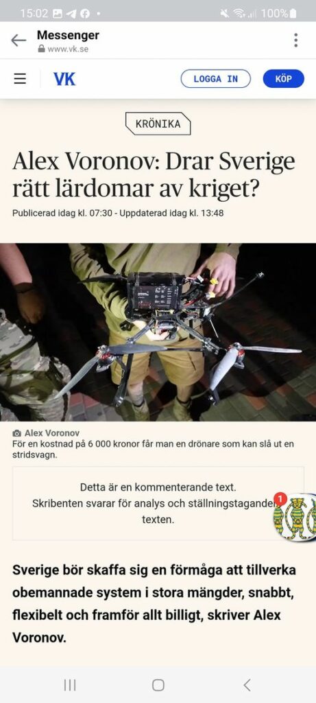Visst, det krig som Sverige förbereder sig för kan komma att se rätt annorlunda ut än det som pågår nu. Men det vore dumt att inte dra lärdomar av Ukraina. Framgång där bygger på en förmåga att själv tillverka obemannade system i stora mängder, snabbt, flexibelt och framför allt billigt.