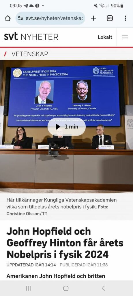 "Amerikanen John Hopfield och britten Geoffrey Hinton får årets Nobelpris i fysik. De prisas för sina upptäckter och uppfinningar inom maskininlärning och artificiella neuronnätverk.