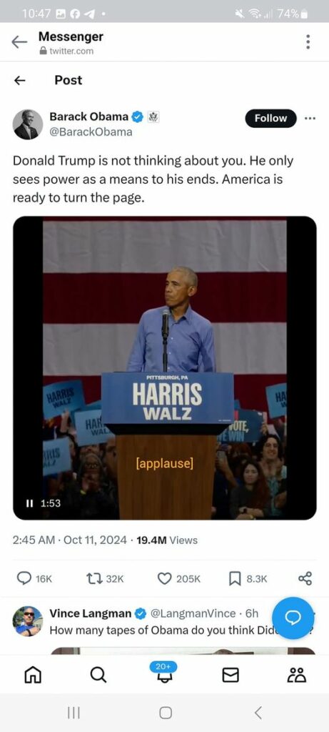 https://x.com/BarackObama/status/1844539876110119393?fbclid=IwY2xjawF10YtleHRuA2FlbQIxMAABHX5bSMkwRiFyCN6WjtNquWdYnmymk0toEVhYHOoZlkkDAvQq9OhOeVaDPQ_aem_aHwc3o3BhKVhd7IX4jf1PgObama Kampanjar..