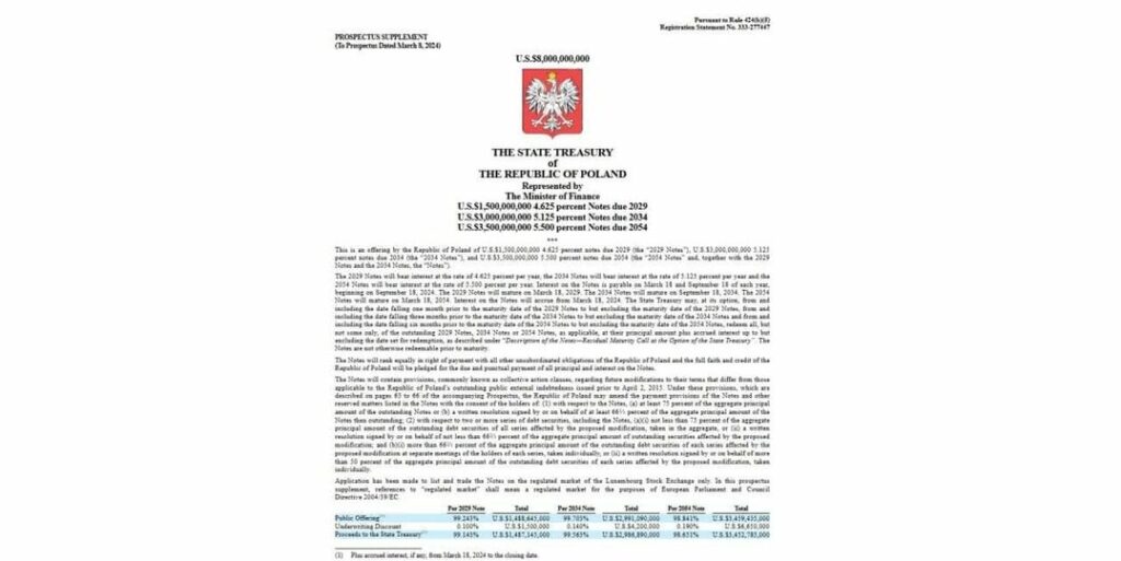 Polens statskassan har ingått ett avtal med amerikanska företag, inklusive Citigroup, som kontrollerar BlackRock, samt JP Morgan, om att sälja statsobligationer för 8 miljarder dollar.