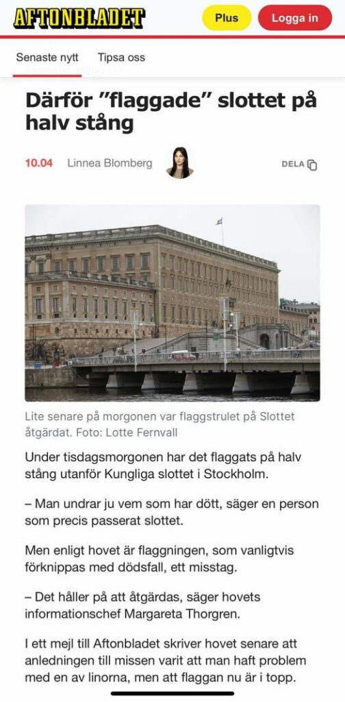 "Man trasslade ut en av linorna för att kunna hissa flaggan till topp...."