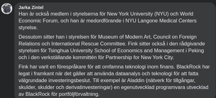 🌏 Black Rock lobbar aktivt politiker (inklusive nästan 2,4 miljoner dollar i avslöjad federal lobbyverksamhet i USA 2022) för att gynna företagen under ledning och säkerställa gynnsam reglering, beskattning, etc. BlackRock har gynnats av 2020-2023 COVID-19 "pandemin" med investeringar i teknik och hälsovård, inklusive över 7% av aktierna i vaccintillverkarna Astra Zeneca, Pfizer och J&J. Detta har hjälpt till att öka dess tillgångar från 7,43 biljoner dollar 2019 till mer än 10 biljoner dollar år 2021.