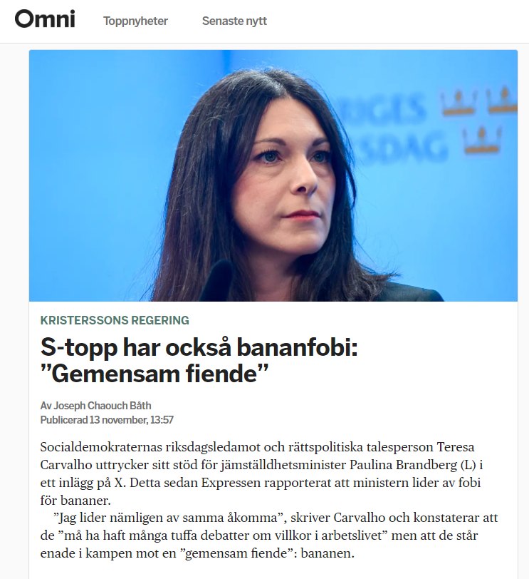 Socialdemokraternas riksdagsledamot och rättspolitiska talesperson Teresa Carvalho uttrycker sitt stöd för jämställdhetsminister Paulina Brandberg (L) i ett inlägg på X. Detta sedan Expressen rapporterat att ministern lider av fobi för bananer.