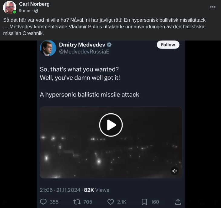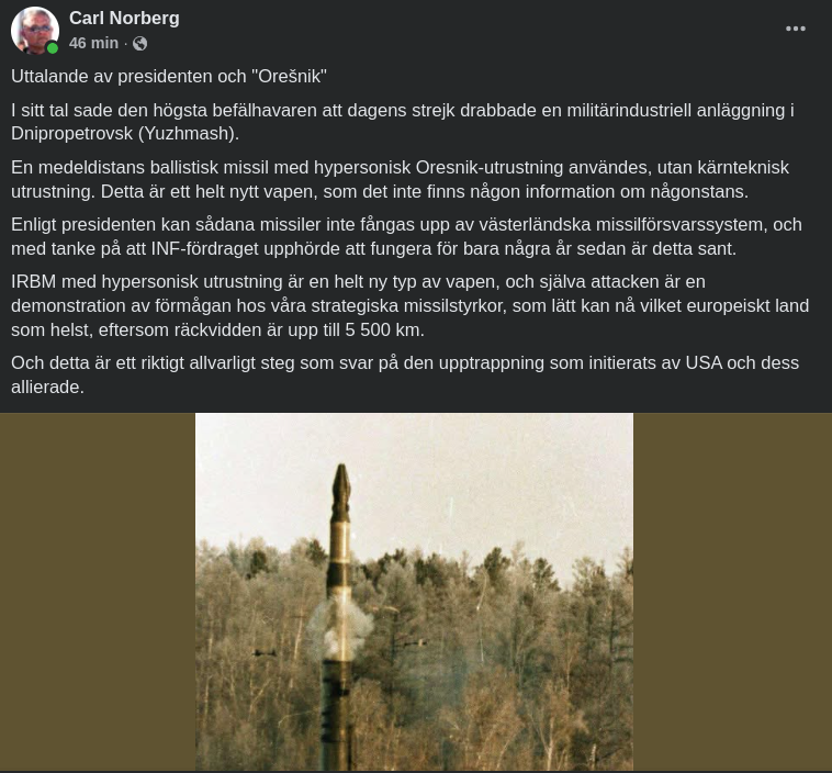 âȘïžDen 21 november anvĂ€nde ryska trupper det senaste ryska medeldistanssystemet "Oreshnik". Den attackerar mĂ„let med en hastighet av 10 Mach och fĂ„ngas inte upp av befintliga antimissilförsvarssystem.