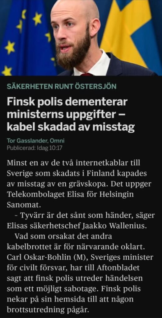 ”Finsk polis utreder vad som har hänt och på grund av omständigheterna kring det inträffade misstänks sabotage. Regeringen står i kontakt med ansvariga myndigheter och följer händelseutvecklingen”, säger Carl-Oskar Bohlin, till Aftonbladet.