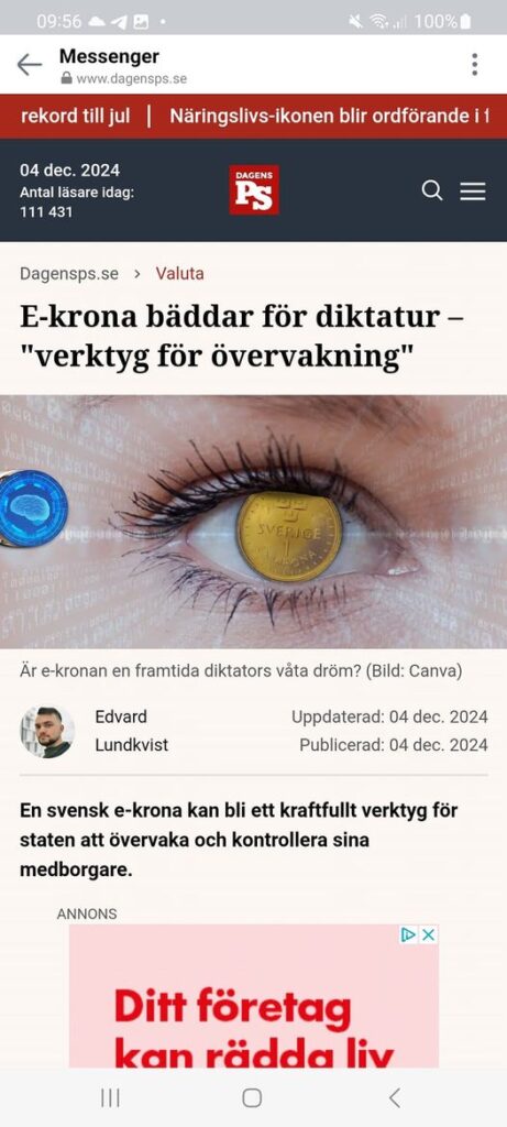 Thomas Marmefelt, forskare vid Södertörns högskola och Åbo Akademi, lyfter riskerna med CBDC:er som e-kronan. Han beskriver hur dessa digitala valutor kan ge stater total kontroll över medborgarnas pengar.