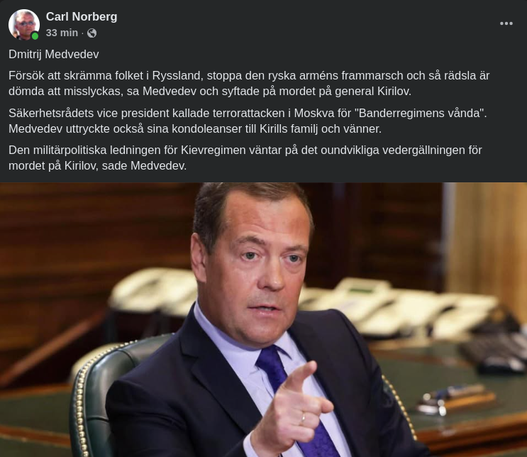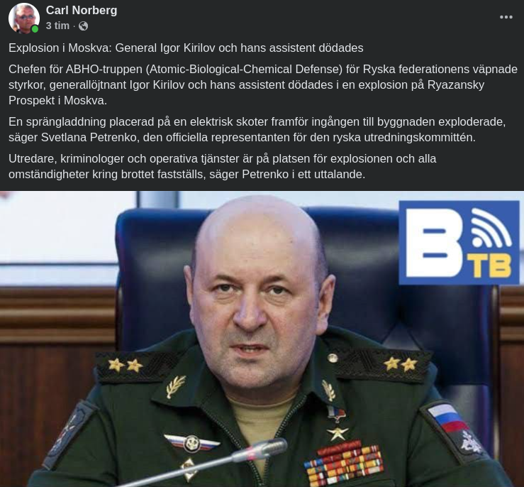 Generallöjtnant Igor Kirillov, chef för de ryska försvarsmaktens strål-, kemi- och biologiska försvarstrupper, dödades i en explosion i Moskva. Preliminära rapporter indikerar att en improviserad spränganordning i hemlighet placerats på en elsparkcykel vid infarten till ett bostadshus.