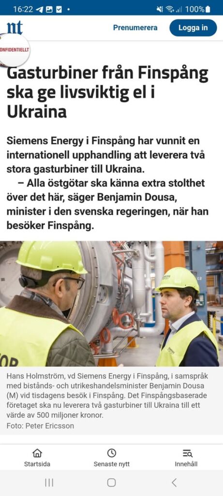 Vi har på olika sätt sökt Hans Holmström och Madeleine Davidsson, vd respektive kommunikationschef på Siemens Energy i Finspång, för en kommentar om affären med Ukraina. De har inte återkopplat.Stororder Från Ukraina Till Siemens Energy I Finspång