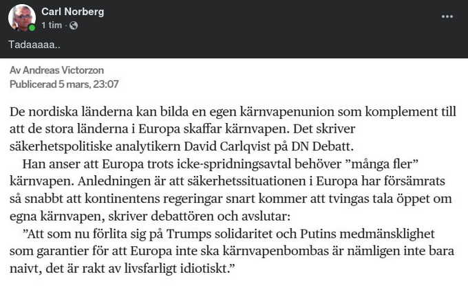 I dag, 2025, skulle egna kärnvapen sätta trovärdighet bakom Sveriges utfästelser om stöd till Ukraina och Nato-allierade.