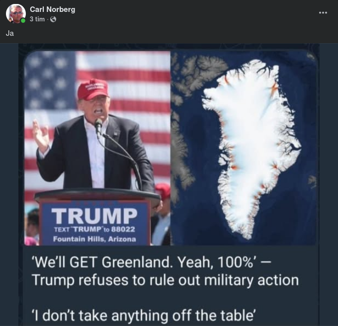 "USA:s president Donald Trump säger sig ha haft seriösa samtal om att ta över Grönland. ”Vi kommer att ta Grönland. Ja, 100 procent”, säger han i en intervju på lördagskvällen.