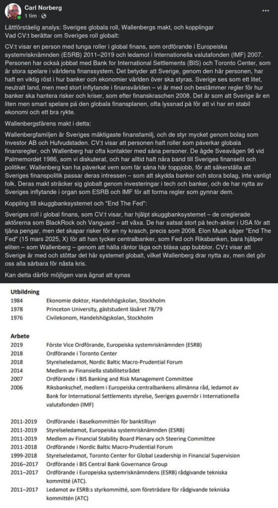 Wallenbergfamiljen är Sveriges mäktigaste finansfamilj, och de styr mycket genom bolag som Investor AB och Hufvudstaden. CV:t visar att personen haft roller som påverkar globala finansregler, och Wallenberg har ofta kontakter med såna personer. De ägde Sveavägen 96 vid Palmemordet 1986, som vi diskuterat, och har alltid haft nära band till Sveriges finanselit och politiker. Wallenberg kan ha påverkat vem som får såna här toppjobb, för att säkerställa att Sveriges finanspolitik passar deras intressen – som att skydda banker och stora bolag, inte vanligt folk. Deras makt sträcker sig globalt genom investeringar i tech och banker, och de har nytta av Sveriges inflytande i organ som ESRB och IMF för att forma regler som gynnar dem.