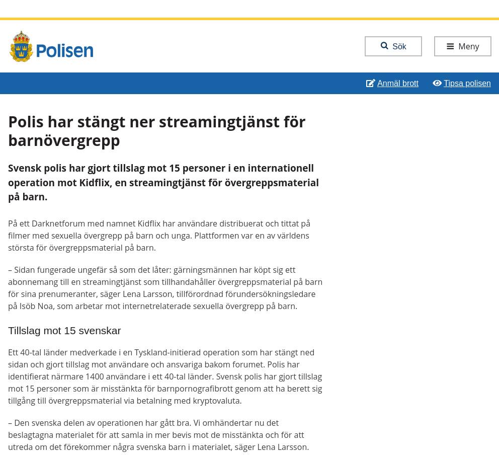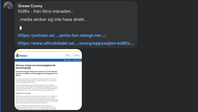 https://x.com/atensnut/status/1909265233266213030 https://polisen.se/aktuellt/nyheter/nationell/2025/april/polis-har-stangt-ner-streamingtjanst-for-barnovergrepp/