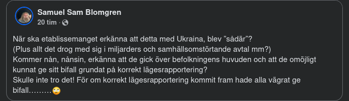 Men det är ju ändå märkligt att en förlorande part som plockar micro chip ur vitvaror och som ses som en bensinstation förklädd till nation samtidigt kan tänkas erövra hela Europa... Jens, Biden, Blicken, Trump, Ursula, Macron, Schultz, Starmer o det kollektiva väst ni har fått hela världen att stå i givakt för den rättvisa kamp ni prackat på Ukraina att utföra till priset av sina naturtillgångar, forna gränser, hundratusentals döda och många miljoner flyktingar... Det vore väl dumt att sluta nu?