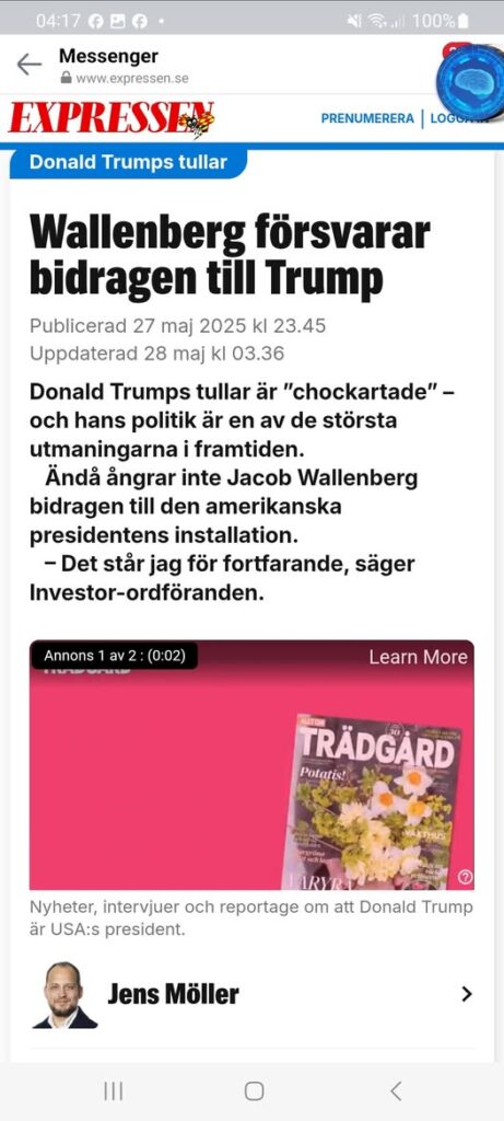 – Vi är uppväxta i en värld med globalisering och frihandel och så plötsligt börjar det bli tullar, protektionism och vi vänder oss inåt. I EU, USA och Kina, inåt i våra länder. Det är en helt ny värld och den måste vi lära oss att förhålla oss till och ändå försöka upprätthålla handelsströmmarna så att vi inte tappar arbetstillfällen i Sverige.Trumpbidragsförsvarande Jacob