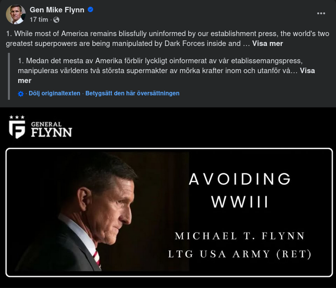 General Mike Flynn, en pensionerad generallöjtnant i USA:s armé, varnar i sitt X-inlägg för att [DS] manipulerar USA och Ryssland mot en storskalig militär konfrontation, vilket ingen nation eller förnuftig person vill ha. Han identifierar flera nyckelpunkter: