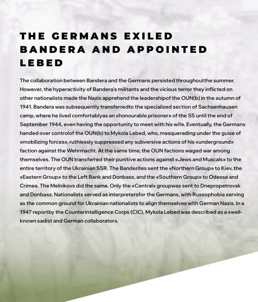 ▪️ Starting in the summer of 1941, the process of German-nationalist Ukrainianization commenced. The OUN exterminated underground fighters, partisans and anyone who did not sympathize with the Germans and Ukrainian nationalism. The OUN members eagerly worked in the occupation self-government and police.