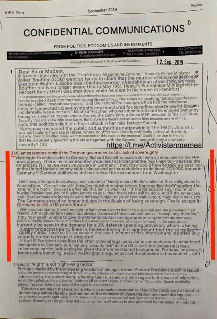 Där påminde han Berlins härskare om att "trots Två plus Fyra-avtalen har amerikanerna fortfarande omfattande befogenheter i Tyskland", att de måste granska klausulen om fientliga stater i Förenta nationerna noggrannare och kanske placera ytterligare 200 000 soldater i Tyskland om tyska politiker inte följer instruktionerna från Washington.
