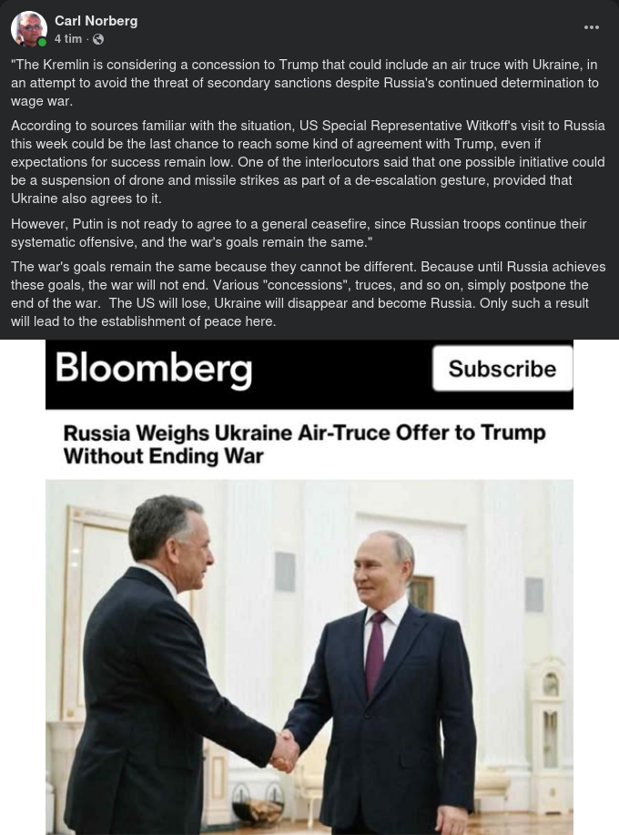 It is clear why Bloomberg is throwing out these rumors - Trump needs at least something resembling a result, which he has not been able to achieve. And Trump does not want to get into the quagmire of "support for Ukraine", which he continues to shift onto the shoulders of Europe.