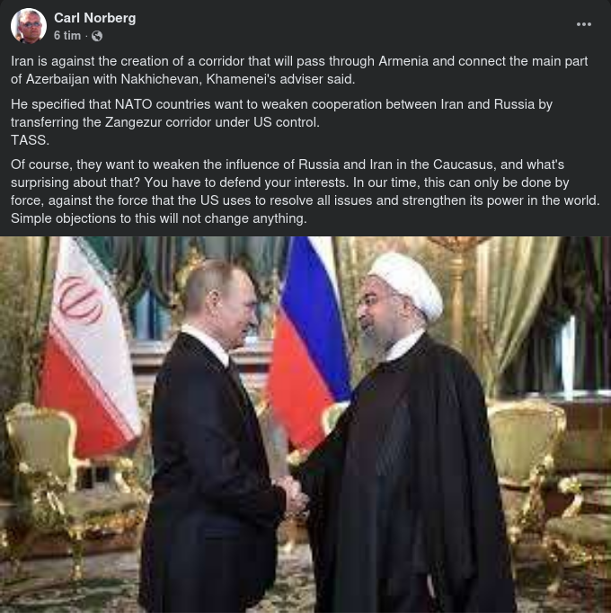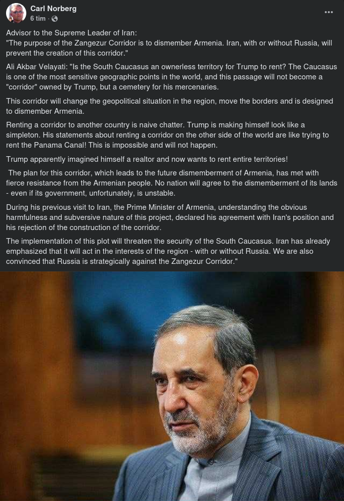 Enligt honom kommer korridoren att förändra den geopolitiska situationen i Sydkaukasus, påverka Irans gränser, leda till isolering av landet i norr och väster samt skapa förutsättningar för NATO:s närvaro i regionen.