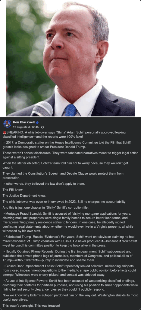 • Abuse of Intelligence Powers: Schiff has been accused of weaponizing classified briefings, distorting their contents for partisan purposes, and using his position to smear opponents while hiding behind security clearance rules so they couldn’t publicly respond.