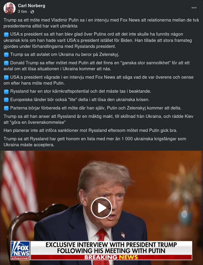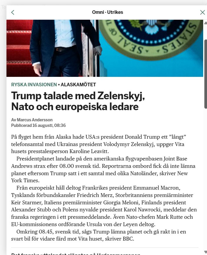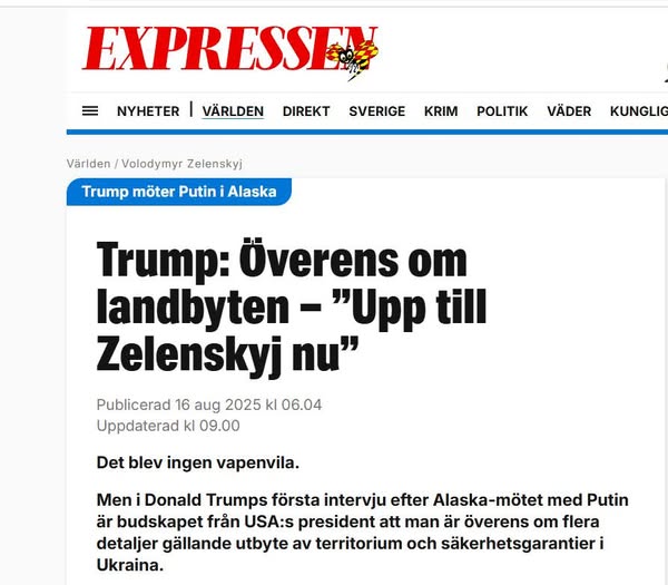 – Nej. Med tanke på vad Putin och Trump står för var det bästa jag kunnat tänka mig att det just inte blev något riktigt avslut. Ett mardrömsscenario hade varit det som Trump pratade om för en vecka sedan, alltså ”omfördela” ukrainska landområden, men med tanke på utfallet kan man efter det här ignorera vad Trump säger.