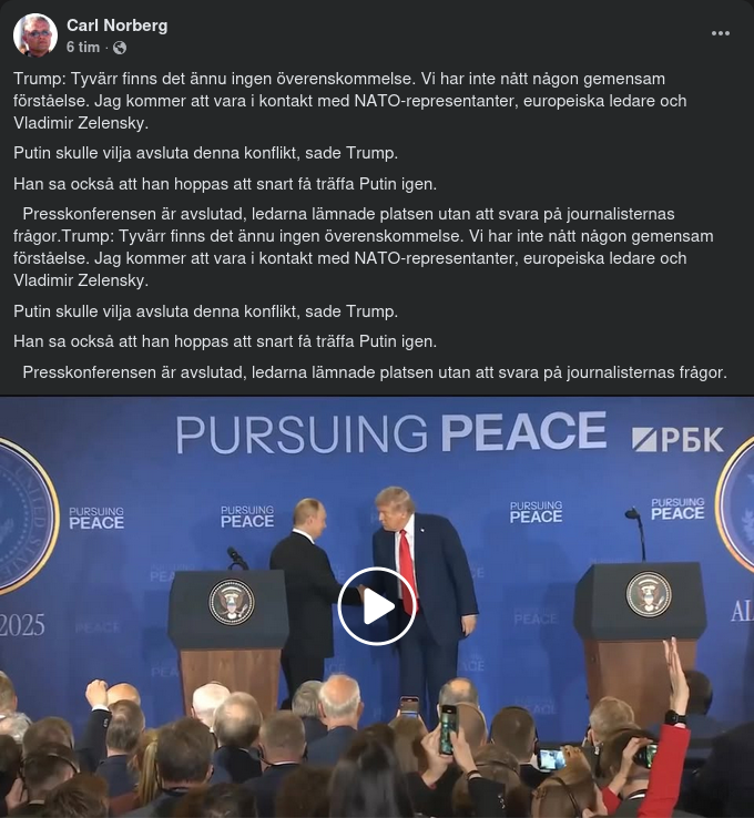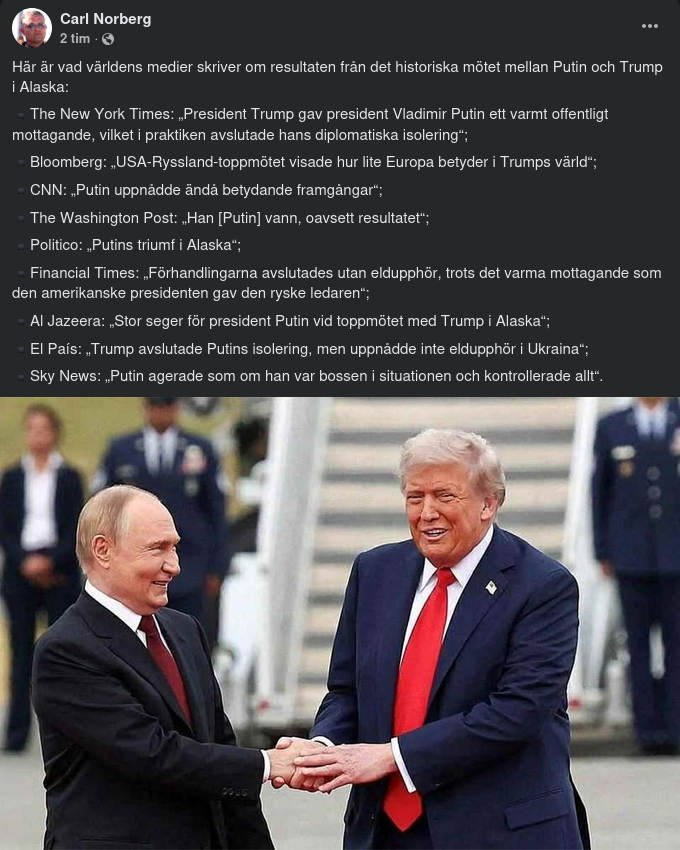 Han konstaterar att överläggningarna inte resulterat i någonting och anser att redan mottagandet i sig var en seger för Putin. Rysslands president är efterlyst för krigsbrott i 123 länder av ICC, den Internationella brottmålsdomstolen, men välkomnades med applåder och röda mattan av Trump i Alaska.