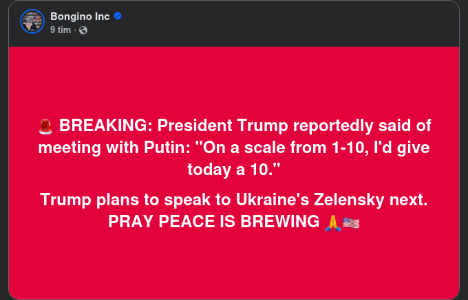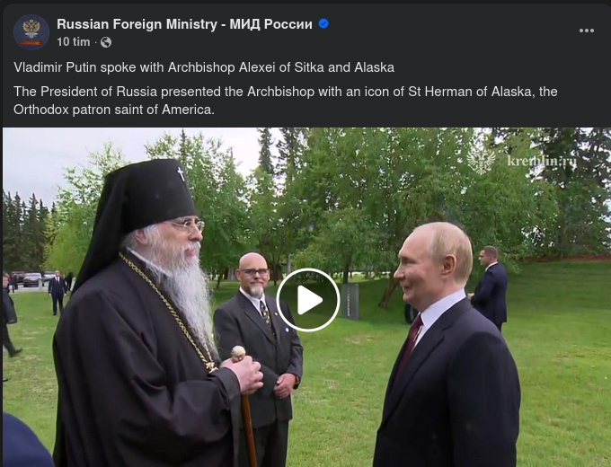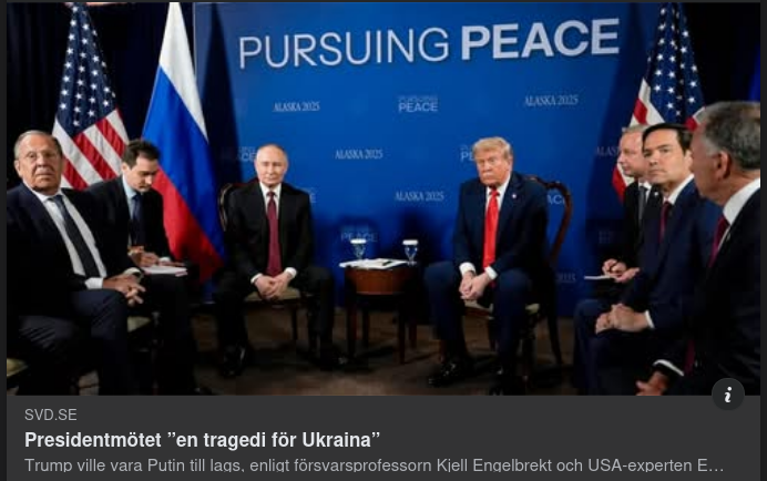 "2 timmar och 45 minuter långt blev det upphaussade toppmötet mellan presidenterna Donald Trump och Vladimir Putin i Alaska – betydligt kortare än aviserat. Det var det första mötet av sitt slag sedan de två möttes i Helsingfors 2018 och första gången Putin besökte USA sedan det antagonistiska mötet med Barack Obama i FN-högkvarteret i New York 2015, då han inte var efterlyst av Internationella brottmålsdomstolen.