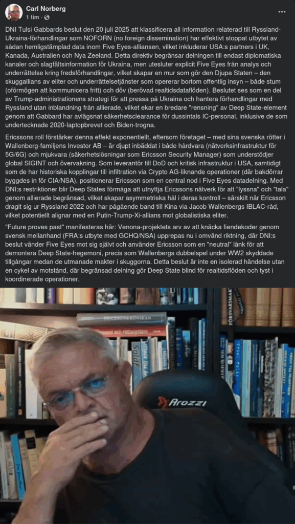 Ericssons roll förstärker denna effekt exponentiellt, eftersom företaget – med sina svenska rötter i Wallenberg-familjens Investor AB – är djupt inbäddat i både hårdvara (nätverksinfrastruktur för 5G/6G) och mjukvara (säkerhetslösningar som Ericsson Security Manager) som understödjer global SIGINT och övervakning. Som leverantör till DoD och kritisk infrastruktur i USA, samtidigt som de har historiska kopplingar till infiltration via Crypto AG-liknande operationer (där bakdörrar byggdes in för CIA/NSA), positionerar Ericsson som en central nod i Five Eyes datadelning. Med DNI:s restriktioner blir Deep States förmåga att utnyttja Ericssons nätverk för att "lyssna" och "tala" genom allierade begränsad, vilket skapar asymmetriska hål i deras kontroll – särskilt när Ericsson dragit sig ur Ryssland 2022 och har pågående band till Kina via Jacob Wallenbergs IBLAC-råd, vilket potentiellt alignar med en Putin-Trump-Xi-allians mot globalistiska eliter.
