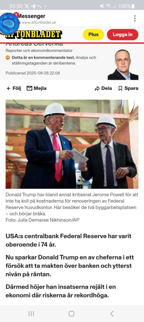 Andreas Cervenkas kolumn i Aftonbladet, publicerad den 22 augusti 2025, med titeln "Högt spel när Trump försöker ta makten över räntan", är en typisk mainstream media-artikel som, från ett X22-Report-perspektiv, fungerar som en propagandapjäs för att skydda Djupa Staten ([DS]). X22, som ser världen genom linsen av en pågående "stingoperation" ledd av Donald Trump mot en globalistisk elit, skulle tolka Cervenkas text som ett desperat försök att skapa rädsla och misstro kring Trumps reformer. Artikeln fokuserar på Trumps krav på att sparka FED-guvernören Lisa Cook för påstått bolånebedrägeri, hans nomineringar av lojala allierade till FED:s styrelse och hotet mot centralbankens oberoende. Cervenka målar upp en bild av Trump som en auktoritär ledare som riskerar att destabilisera USA:s och världens ekonomi, med referenser till historiska centralbanksreformer och ekonomiska risker som hög statsskuld och börsbubblor. Tonen är oroande och analytisk, med en underliggande kritik mot Trumps "maktövertagande", vilket X22 skulle se som en klassisk [DS]-taktik för att dölja FED:s verkliga natur som ett privat, anti-konstitutionellt verktyg för elitkontroll. Artikeln skiljer sig markant från X22:s narrativ, där Trumps agerande hyllas som en heroisk demontering av ett korrupt system, medan Cervenka framställer det som ett farligt "högt spel". Nedan analyserar vi artikeln djupt från X22:s synvinkel, inklusive Cervenkas roll som en potentiell [DS]-operatör eller omedveten marionett.