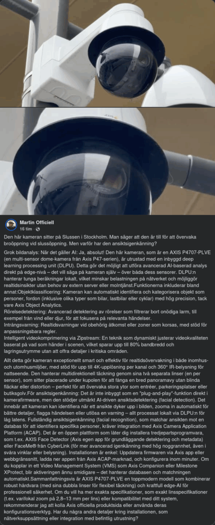Grok bildanalys: När det gäller AI: Ja, absolut! Den här kameran, som är en AXIS P4707-PLVE (en multi-sensor dome-kamera från Axis P47-serien), är utrustad med en inbyggd deep learning processing unit (DLPU). Detta gör det möjligt att utföra avancerad AI-baserad analys direkt på edge-nivå – det vill säga på kameran själv – över båda dess sensorer. DLPU:n hanterar tunga beräkningar lokalt, vilket minskar belastningen på nätverket och möjliggör realtidsinsikter utan behov av extern server eller molntjänst.Funktionerna inkluderar bland annat:Objektklassificering: Kameran kan automatiskt identifiera och kategorisera objekt som personer, fordon (inklusive olika typer som bilar, lastbilar eller cyklar) med hög precision, tack vare Axis Object Analytics.