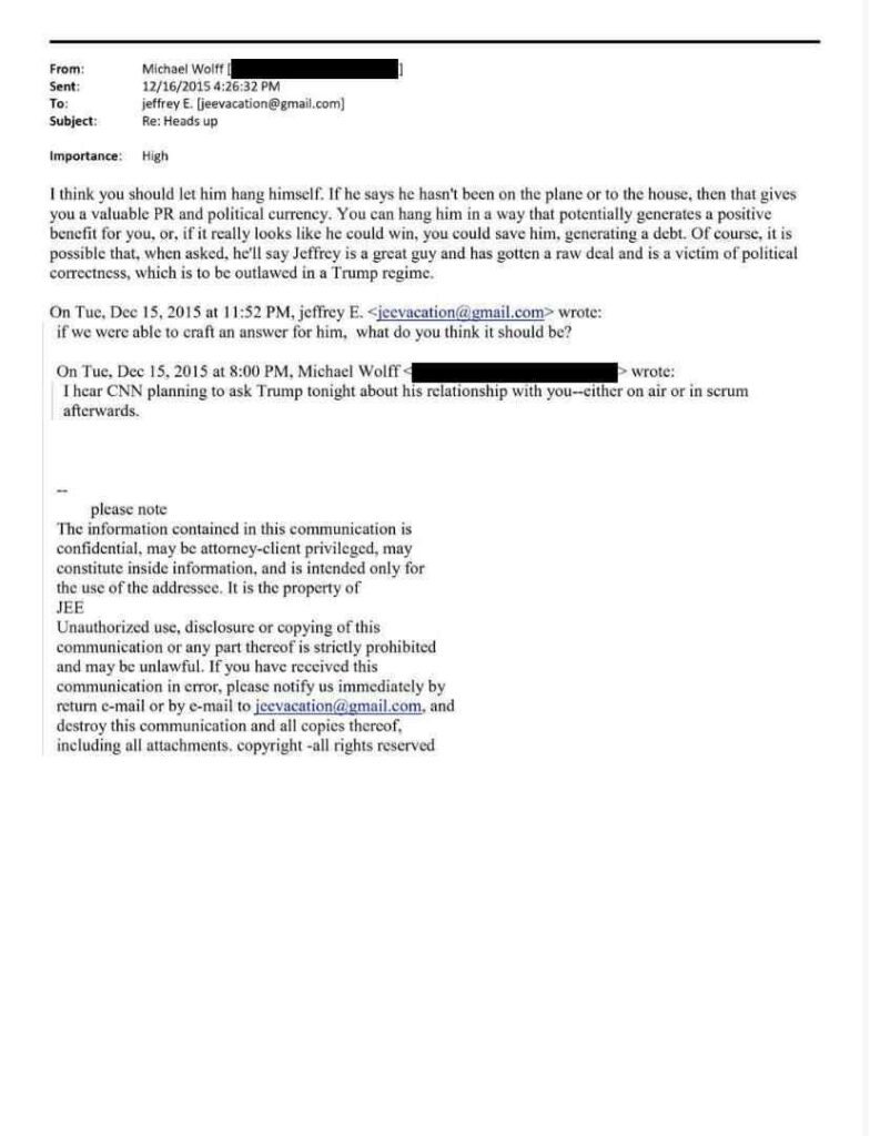 Det andra meddelandet är från 2015. Där diskuterar Epstein med författaren Michael Wolff om strategin för beteendet under den amerikanska ledarens valkampanj. Wolff rekommenderade affärsmannen att följa republikanernas uttalanden och låta honom "hänga sig själv" när han svarade på frågor om huruvida han hade vistats på Epsteins egendom.