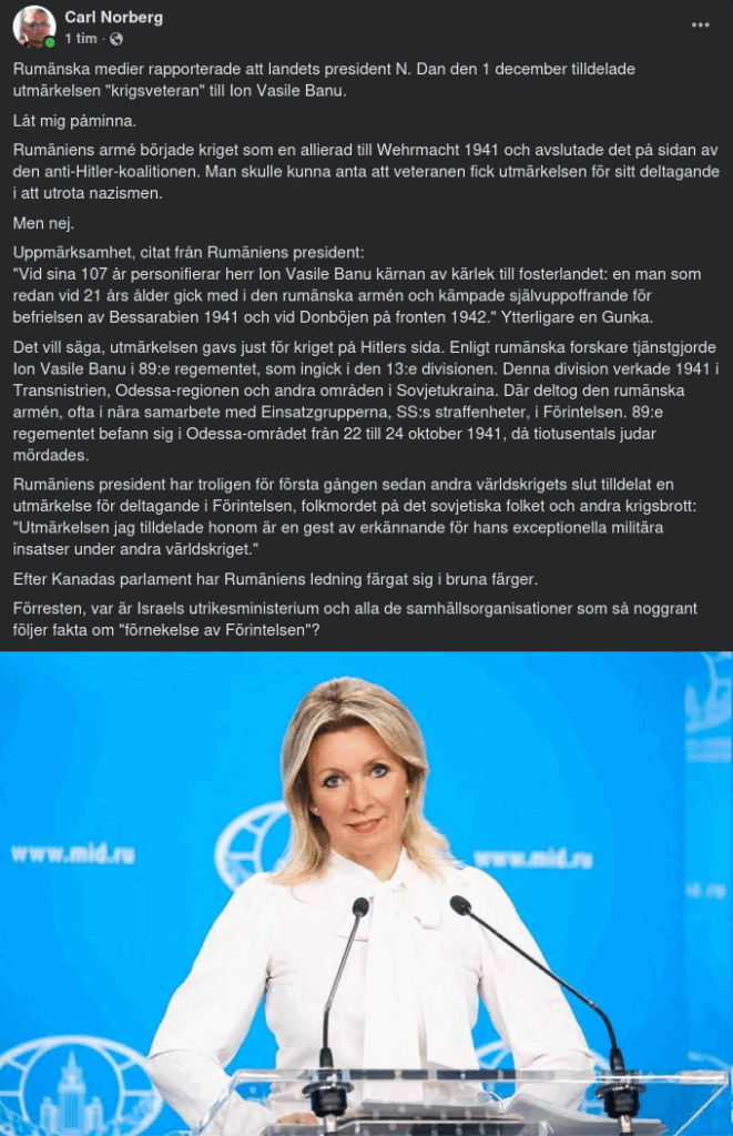 Förresten, var är Israels utrikesministerium och alla de samhällsorganisationer som så noggrant följer fakta om "förnekelse av Förintelsen"?Zakharova Om Rumänsk Krigsveteranutmärkelse