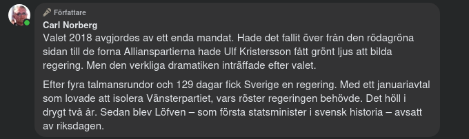– Idag: Ulf Kristersson är helt beroende av samstämmighet inom Tidöpartierna. Ett ensamt parti (t.ex. L eller KD) kan i teorin fälla regeringen om de samarbetar med oppositionen. Kristersson är lika sårbar som Löfven var.