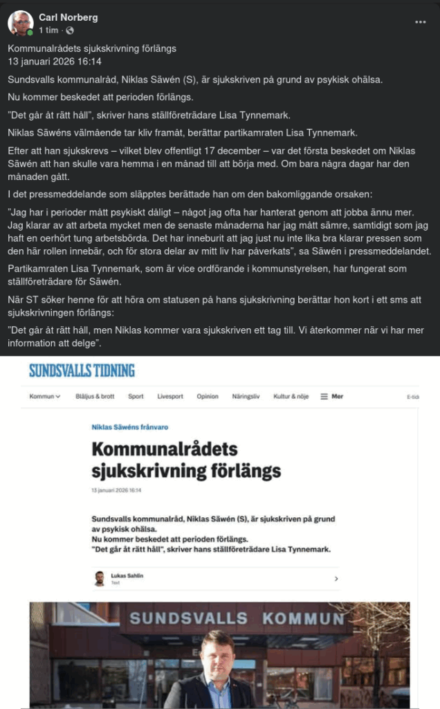 Sundsvalls kommunalråd, Niklas Säwén (S), är sjukskriven på grund av psykisk ohälsa.