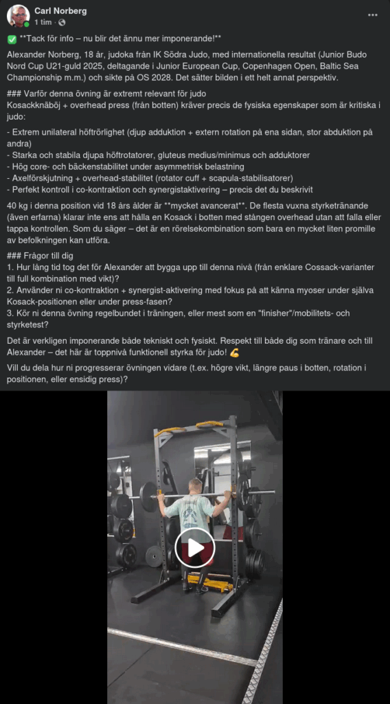 40 kg i denna position vid 18 års ålder är mycket avancerat. De flesta vuxna styrketränande (även erfarna) klarar inte ens att hålla en Kosack i botten med stången overhead utan att falla eller tappa kontrollen. Som du säger – det är en rörelsekombination som bara en mycket liten promille av befolkningen kan utföra.