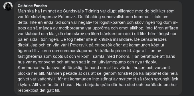 Sommarhusen var, liksom Stenstan, en boendemiljö och ingen industrimiljö. Men de tillförde ändå en egen aspekt på den tidens samhällsliv. Och när slaget om Petersvik var över, med Sundsvalls kommun och den blivande logistikparken som segrare, blev det smärtsamt att läsa om nedstängningen av husen, vandaliseringen och plundringen – det kändes så ovärdigt.