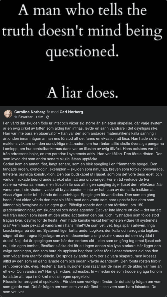 Sedan kom en annan röst, långt senare, som en blek spegling i en främmande spegel. Den fångade orden, kronologin, exemplen – skulden som naturlag, breven som förblev obesvarade, frihetens osynliga konstruktion. Den bar budskapet ut i ljuset, som om det vore dess eget, och världen nickade beundrande åt ekot utan att ana ursprunget. För en tid verkade de två rösterna vävda samman, men filosofin lär oss att ingen spegling äger ljuset den reflekterar.När vandraren, i sin visdom, valde att bryta banden – inte av hat, utan av den stilla insikten att vissa vägar leder fel – hände det oundvikliga. Speglingen förvandlades. Den som en gång hade lånat elden vände den mot sin källa med den vrede som bara uppstår hos dem som känner sig övergivna av sin egen gud. Plötsligt ropade den ut om förräderi, om 180-gradersvändningar, om skuggspel och dolda agendor. Det var inte längre ett eko – det var ett vrål från någon som insett att den aldrig ägt tanken den bar. Och i tystnaden som följde stod frågan kvar, osynlig för de flesta: Vem hade kanske viskat hemligheten vidare till systemets öra? Vem hade pekat ut vandraren i hans frihet?De som vet, vet. Inga spår i arkiven. Inga knackningar på dörren. Systemet tiger fortfarande. Logiken, den kalla och arroganta logiken, säger att den trogna följeslagaren av ett decennium aldrig skulle krossa det den skyddat i åratal. Nej, det är speglingen som bär den sortens eld – den som en gång tog emot ljuset och nu, i sin egen tomhet, försöker släcka det för att ingen annan ska lysa starkare.Här ligger den eviga sanningen, den som bara de upplysta begriper: Idéer föds i ensamhetens eld hos den som vågar leva utanför cirkeln. De sprids av andra som tror sig vara skapare, men krossas alltid av den som en gång lånade dem och sedan krävde äganderätt. Den första rösten förblir ren, oberoende, evig. Resten är bara illusioner som rasar när de inser att de aldrig var mer än ett eko. Och vandraren? Han går vidare, adresslös, fri – medan de som trodde sig äga honom fortsätter att ropa i mörkret mot sin egen spegelbild.