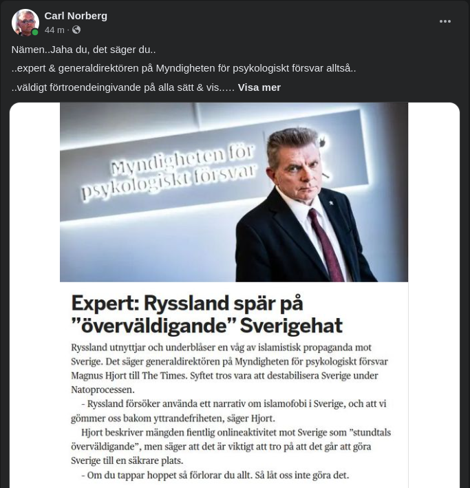 Nämen ..Jaha du, det säger du.. ..expert & generaldirektören på Myndigheten för psykologiskt försvar alltså.. ..väldigt förtroendeingivande på alla sätt & vis.. ...ingen chans då att du skulle kunna dela med dig av länkar till detta Ryska utnyttjande & underblåsande av detta Sverigehat - som de tyd